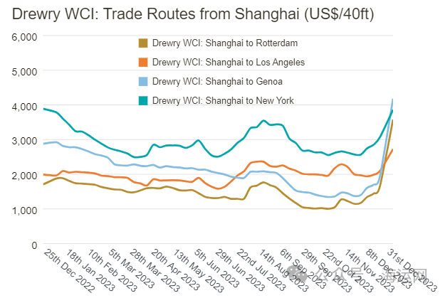紅海危機導致通行受阻,被迫繞行之下,運輸時間勢必拉長。與此同時,運輸綜合成本也水漲船高。有托運商表示,有四個貨柜從中國到摩洛哥,現在得到的報價和去年12月初差了十幾萬元。有貨代公司反饋,之前發一個集裝箱的價格是2300美元-2400美元,現在保守估計要6500美元左右。